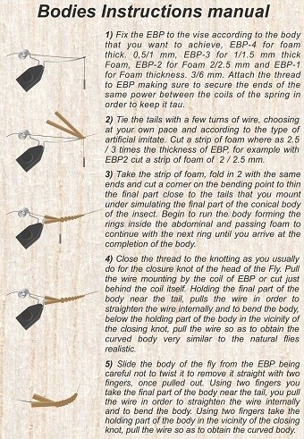 I GVS EBP vengono forniti in Kit di 4 supporti esattamente: GVS EBP1, GVS EBP2, GVS EBP3, GVS EBP4, possono essere utilizzati per la costruzione di corpi estesi per i seguenti insetti artificiali: Mayfly, Caddisfly, Stonefly e Terrestrial oltre che per qualsiasi altro tipo di imitazione di insetti galleggianti.